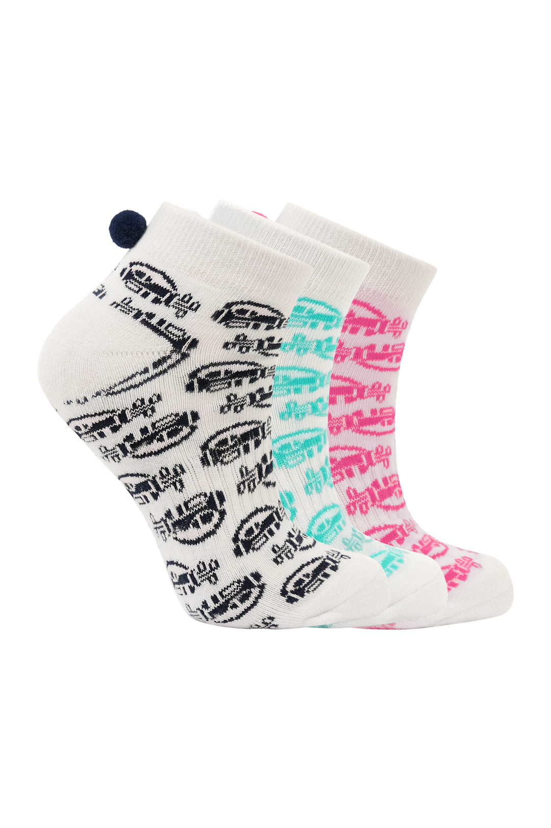 These multi-colored Ladies Golf Socks in Pink, Navy and Aqua with subtle golf bag / golf club motifs come in a convenient 3 pair pack. They also feature pom poms on the heel with a cushioned sole and compression fit, ensuring maximum comfort and prevent slipping down your foot. Crafted from a luxurious and stretchy cotton blend, these socks provide excellent support and breathability, keeping your feet dry and comfortable all day long. The durable fabric retains its shape even after multiple washes, making them perfect for the summer season.