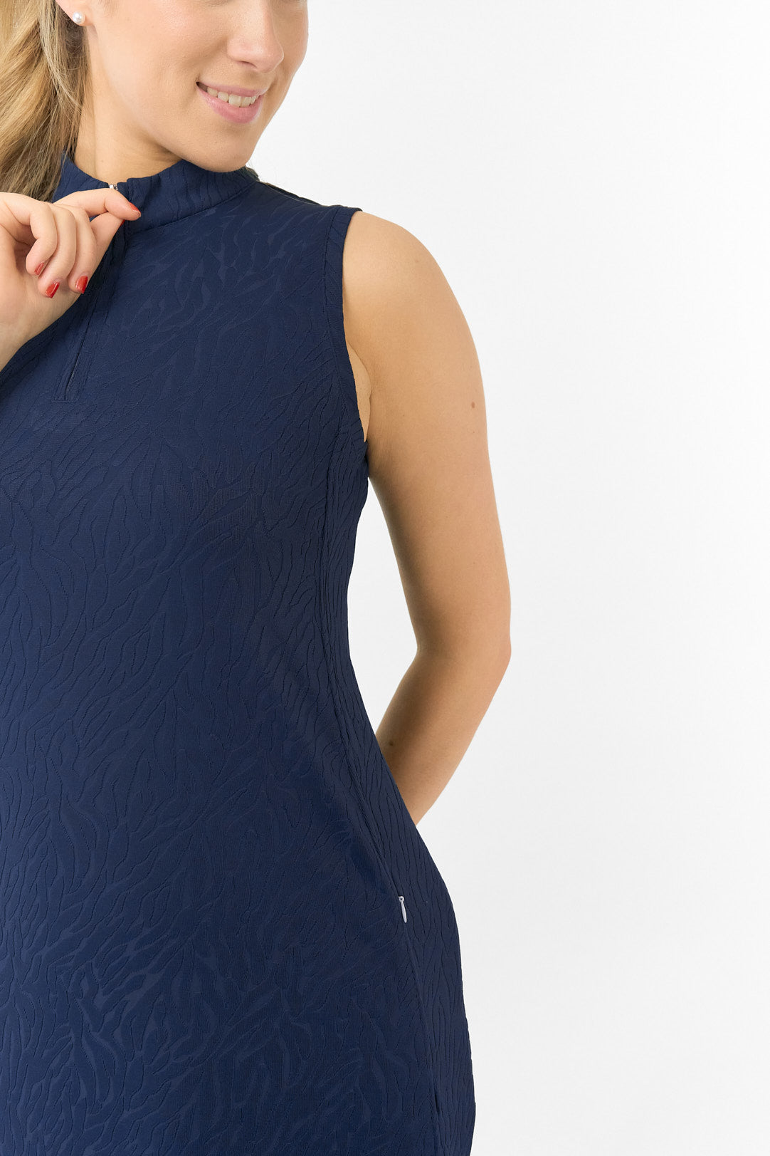 The Sabrina Sleeveless Textured Dress brings a new level of grace to the green, blending the technical precision of high-performance sportswear with the effortless chic of a summer classic. Defined by its intricate textured finish, this all-in-one piece is designed for the woman who wants to transition from a powerful drive to a clubhouse lunch without missing a beat.