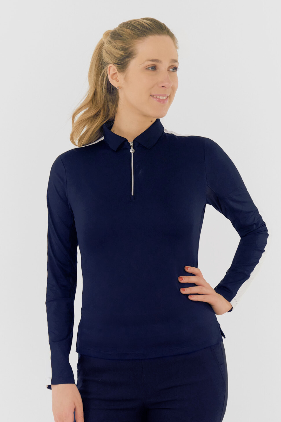 The Nina polo from NVO in navy keeps you performing at your best while looking stylish, no matter the occasion. With a UPF 50+ sun protection rating, this women's golf polo allows you to enjoy your game under the sun with confidence, knowing your skin is well-protected.