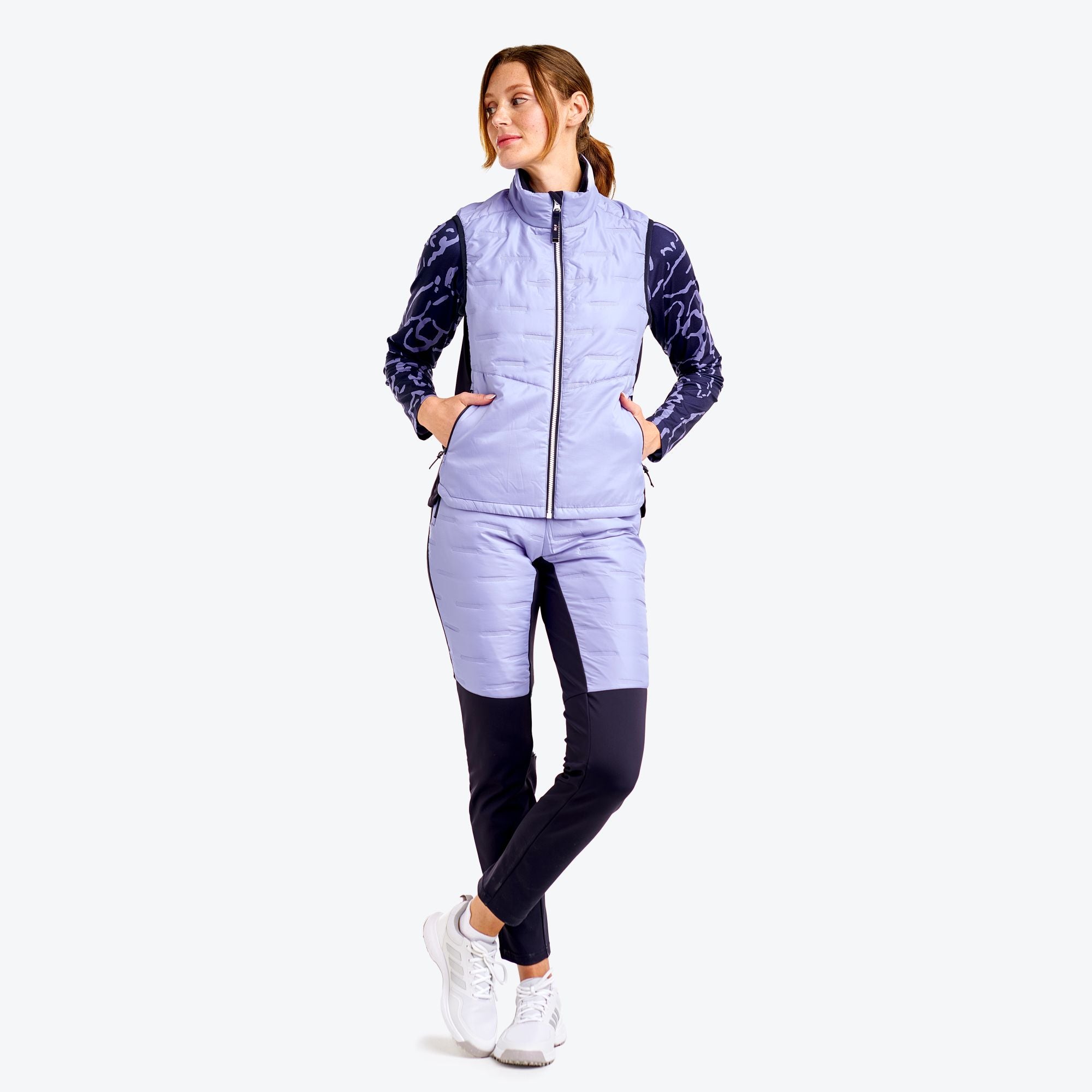 The Drew ladies golf vest from Nivo combines comfort and performance with its modern and functional design. Featuring sonic-weld seams, zippered pockets, and water and wind protection, it’s perfect for facing the elements while staying stylish on the course. The brushed fabric on the inside and insulation at the collar provide pleasant warmth and optimal comfort during your golf rounds.