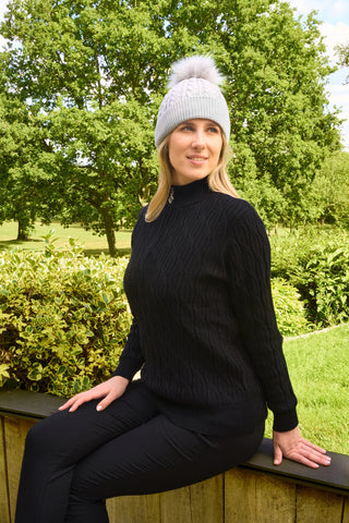 Ladies blue fleck ladies golf hat In an attractive cable knit design. This hat has three layers - an inner waterproof layer plus a soft fleece lining which makes it warm and comfortable. Detachable natural look faux fur bobble.