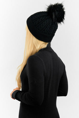 Emerald Green ladies golf hat In an attractive cable knit design. This hat has three layers - an inner waterproof layer plus a soft fleece lining which makes it warm and comfortable. Detachable natural look faux fur bobble.