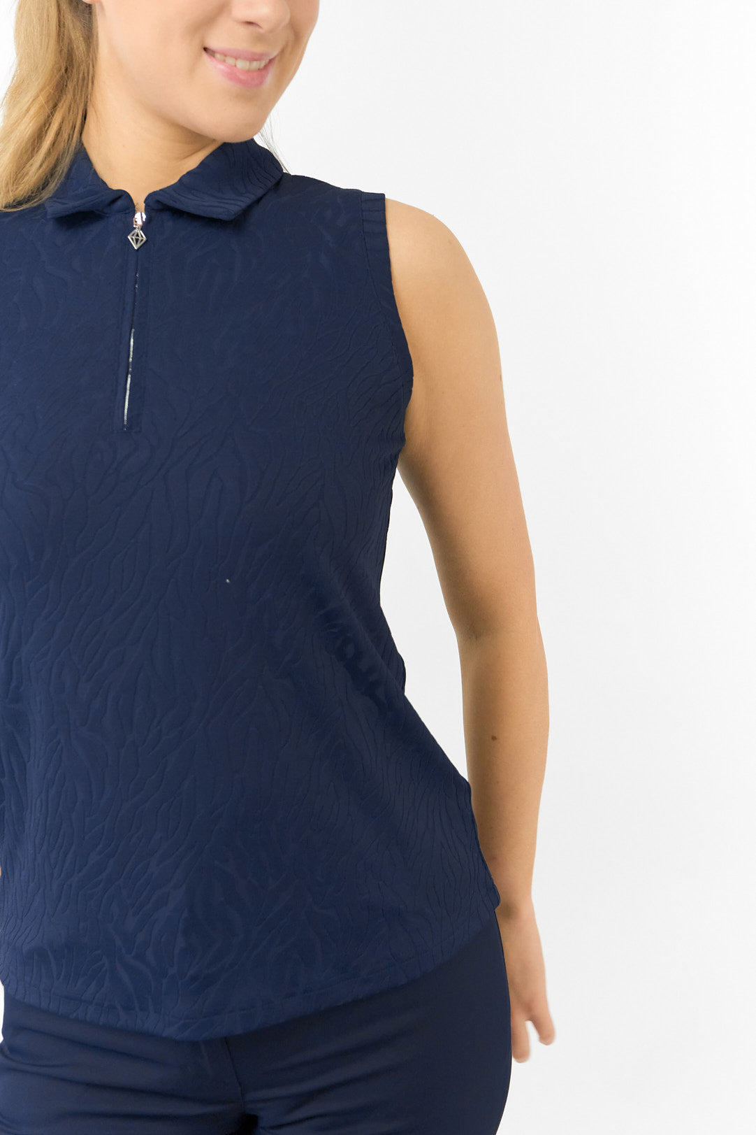The Rebecca Lily Jacquard Sleeveless Polo reimagines golf-course elegance with an athletic, open-arm silhouette. Featuring a delicate textured jacquard fabric, this piece is curated for the golfer who demands high-performance functionality without compromising on a sophisticated, feminine aesthetic.