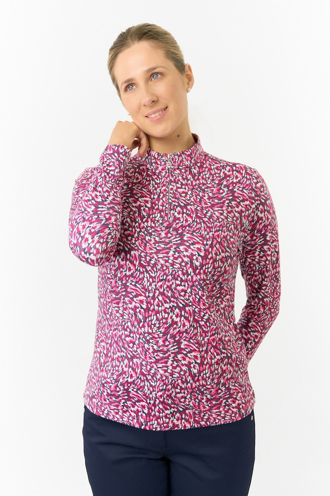 Dynamic and fluid, Plum Ripple brings a fresh energy to the course with its mesmerizing swirl of plum, soft pink, and deep navy. This eye-catching abstract print adds movement and modern flair to your golf wardrobe, striking the perfect balance between sporty and chic. Ideal for someone who plays with passion and dresses with confidence.