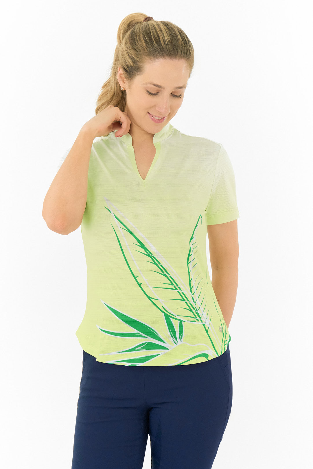Elevate your golf experience with the Flora Mock polo in lime, tailored for golfers who appreciate a blend of style, comfort, and functionality.